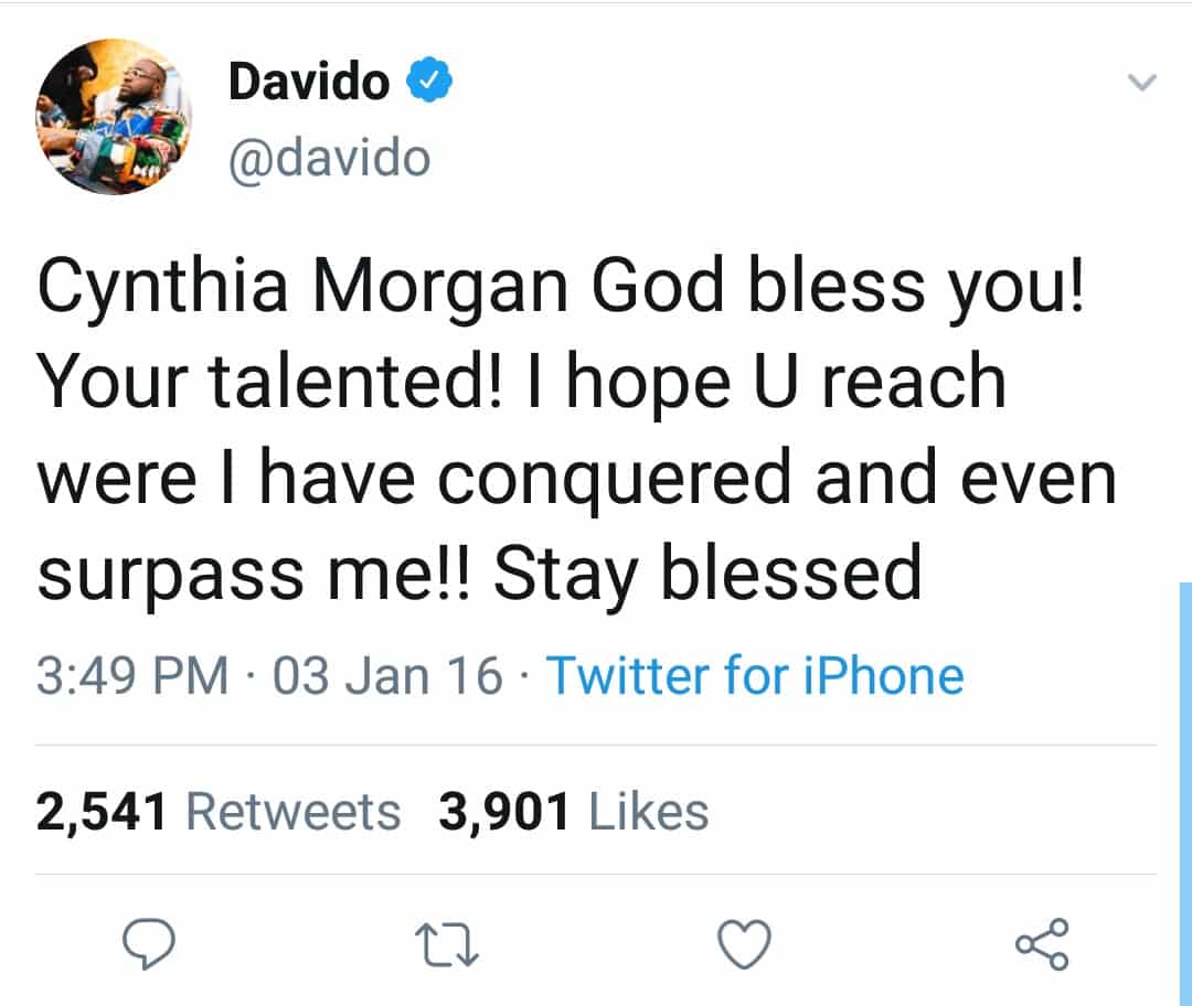 In the old tweet, Davido praised Cynthia Morgan, calling her a talented artiste, while praying for her to surpass him in the music industry.