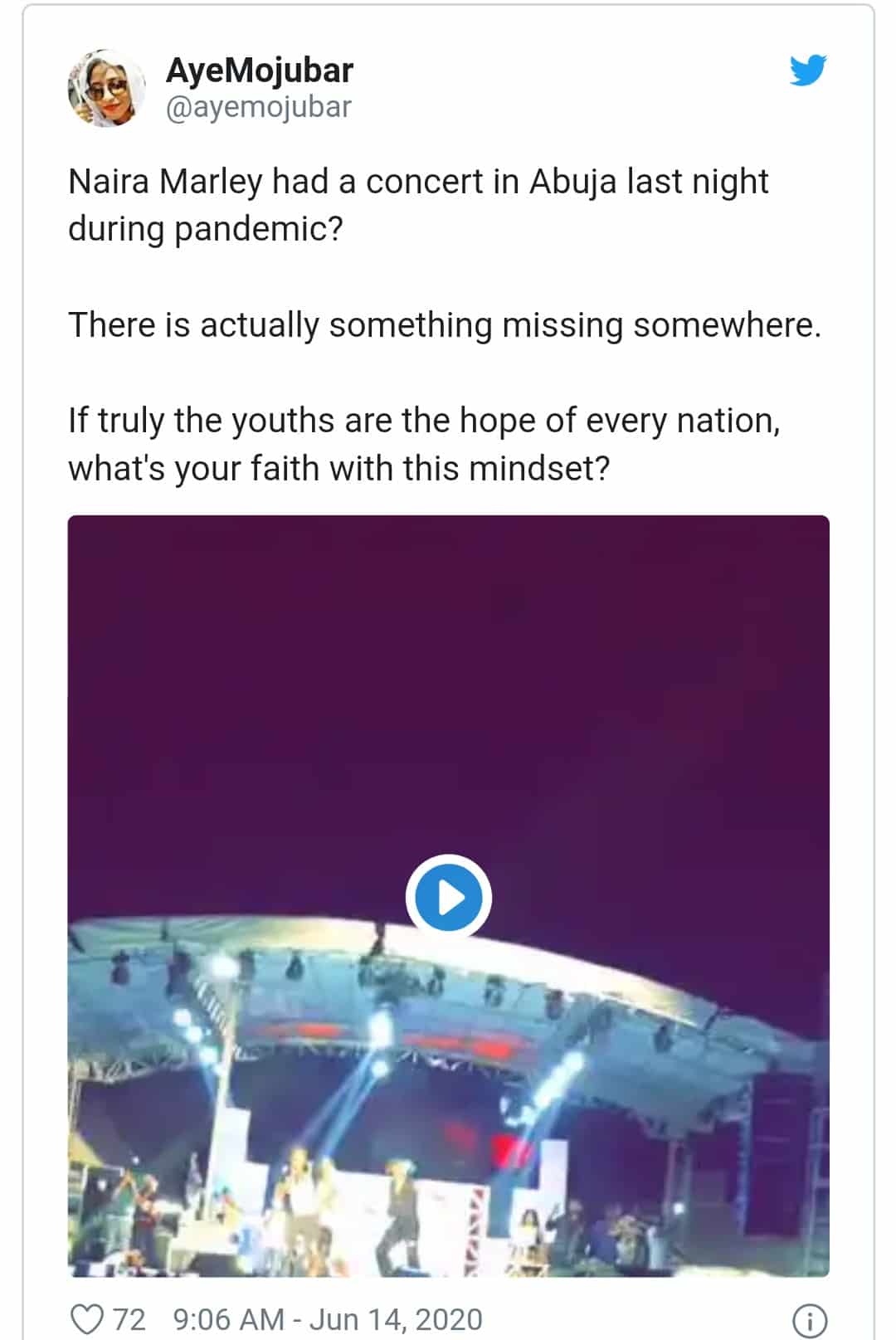 Nigerians on Twitter have condemned the concert, asking why the artiste would hold a concert without regarding the social distancing when the country is battling COVID-19.