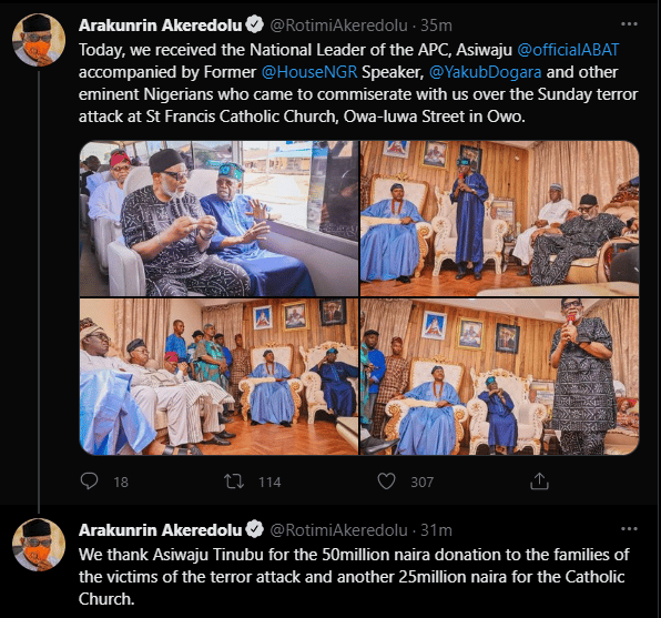 We thank Asiwaju Tinubu for the 50million naira donation to the families of the victims of the terror attack and another 25million naira for the Catholic Church,” he wrote.