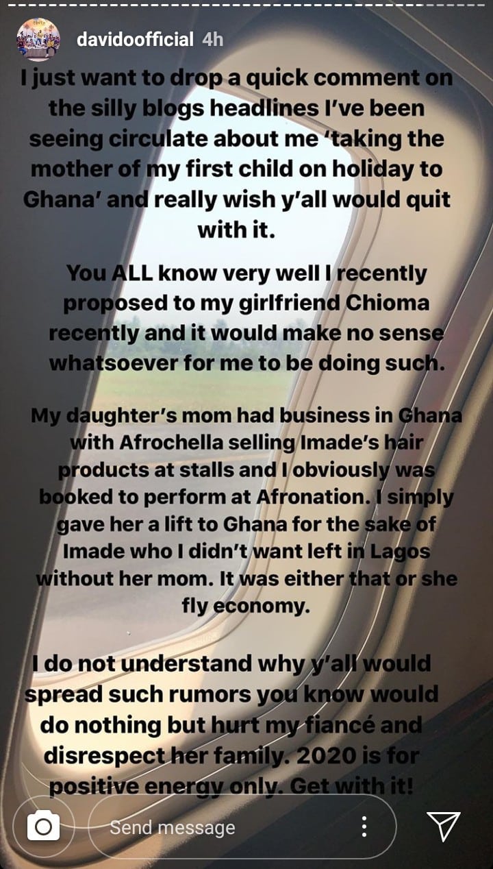 On Thursday evening, singer Davido took to his Instastories to correct the insinuation that he flew with Sophia, his first babymama, and their daughter, Imade, for a mini vacation in Ghana, last week.