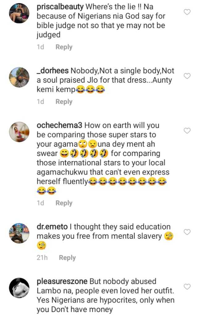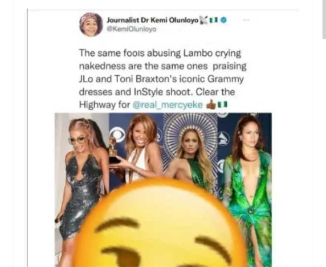 “The same fools abusing Lambo crying [email protected] are the same ones praising JLo and Toni Braxton’s iconic Grammy dresses and inStyle shoot. Clear the highway for Mercy Eke”.