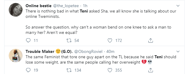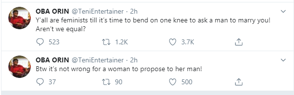 Teni in her tweet said feminists hold on to their ideologies till it’s time for a man to go down on one knee to propose to them. She added that there’s nothing wrong with a lady proposing to her man.