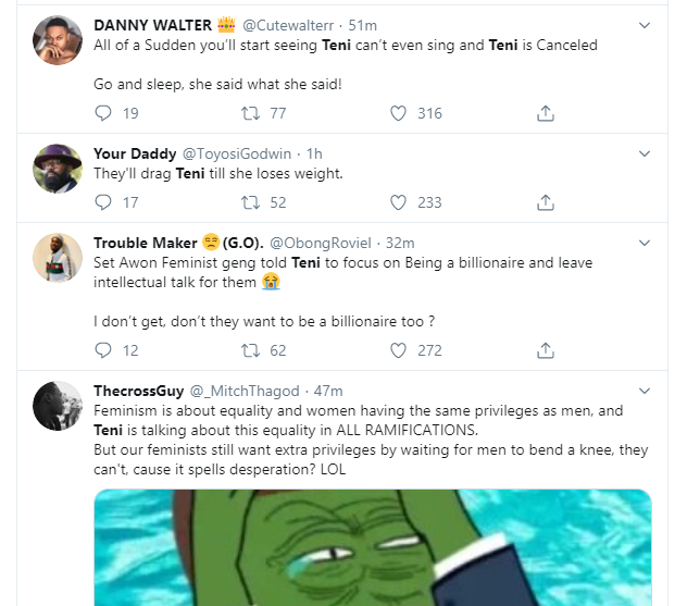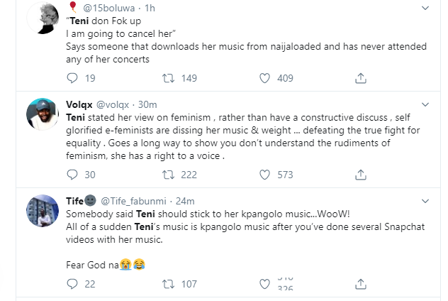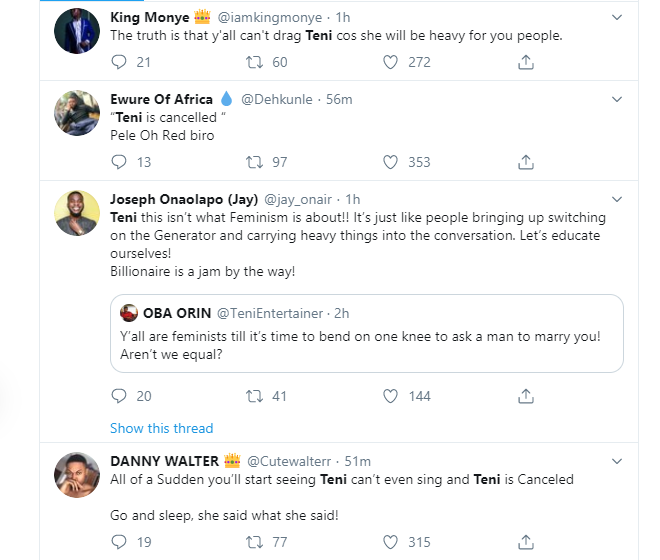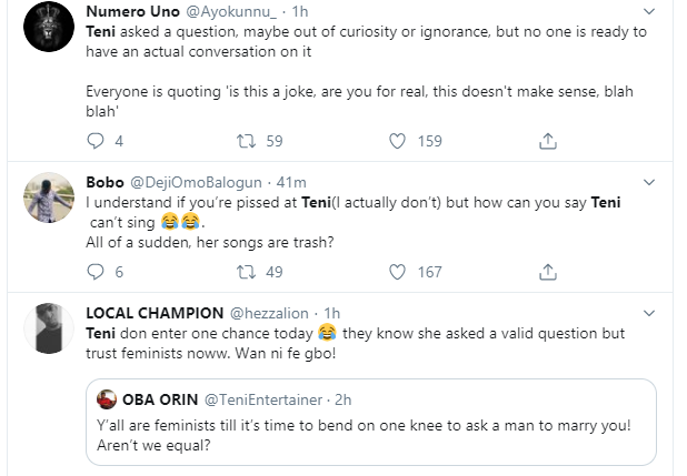 Nigerian singer, Teni ignited a Twitter storm with her view on feminism and marriage proposal.