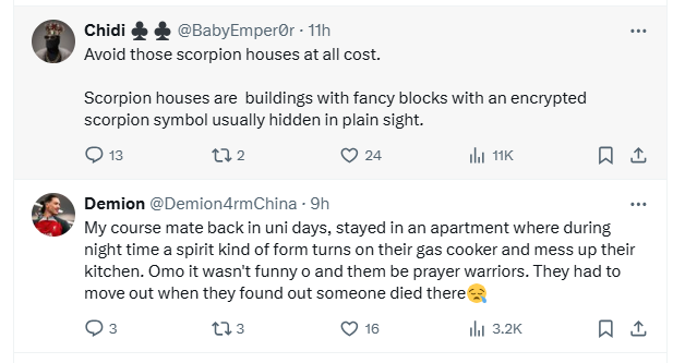@Demion4rmChina wrote: “My course mate back in uni days, stayed in an apartment where during night time a spirit kind of form turns on their gas cooker and mess up their kitchen. Omo it wasn’t funny o and them be prayer warriors. They had to move out when they found out someone died there😪”