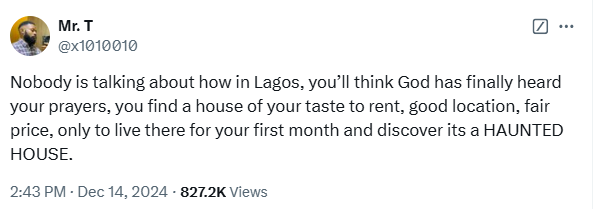 @x1010010 said: “Nobody is talking about how in Lagos, you’ll think God has finally heard your prayers, you find a house of your taste to rent, good location, fair price, only to live there for your first month and discover its a HAUNTED HOUSE.”