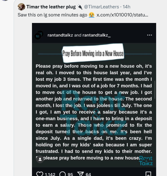 Another said: “Pray Before Moving into a New House Please pray before moving to a new house oh, it’s real oh. I moved to this house last year, and I’ve lost my job 3 times. The first time was the month I moved in, and I was out of a job for 7 months. I had to move out Of the house to get a new job. I got another job and returned to the house. The second month, I lost the job.