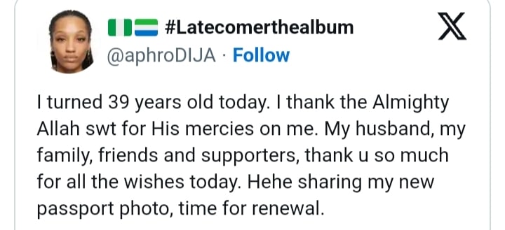 She wrote: “I turned 39 years old today. I thank the Almighty Allah swt for His mercies on me. My husband, my family, friends and supporters, thank u so much for all the wishes today. Hehe sharing my new passport photo, time for renewal.”