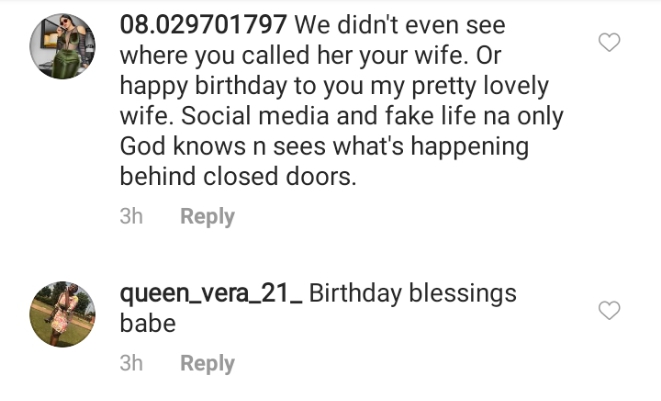 “We didn’t even see where you called her your wife. Or happy birthday to you my pretty lovely wife. Social media and fake life. Na only God knows and sees what’s happening behind closed doors”.