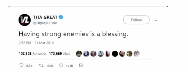 One hour before the shooting, Nipsey tweeted a message on his account that read, “Having strong enemies is a blessing.”