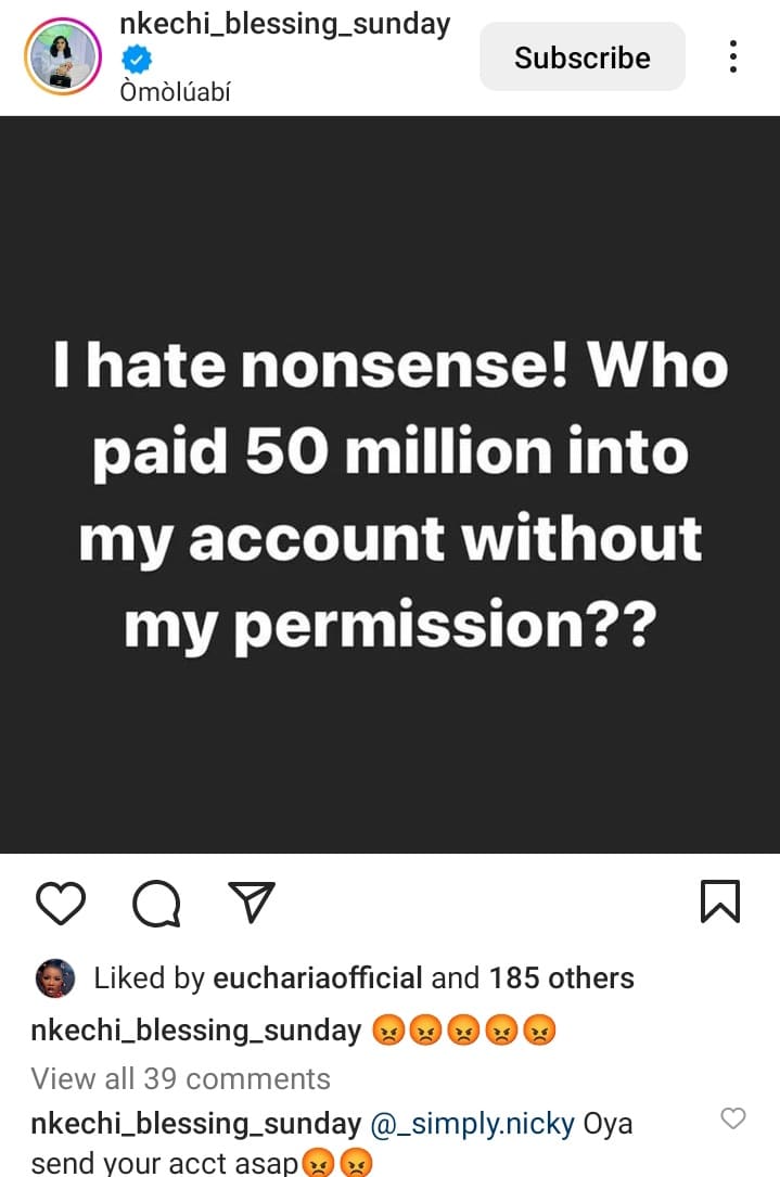 Nkechi Blessing boils with fury after someone credited N50M without her permission