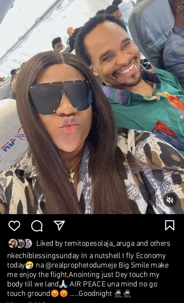She wrote: “In a nutshell I fly Economy today, na @realprophetodumeje Big Smile make me enjoy the flight, Anointing just Dey touch my body till we land AIR PEACE una mind no go touch ground …..Goodnight.”