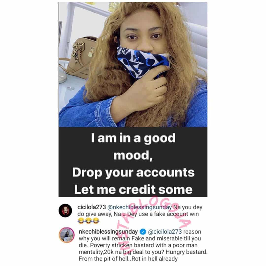 Controversial Nollywood actress, Nkechi Blessing Sunday was dragged into an exchange with a follower who accused her of doing fake giveaways.