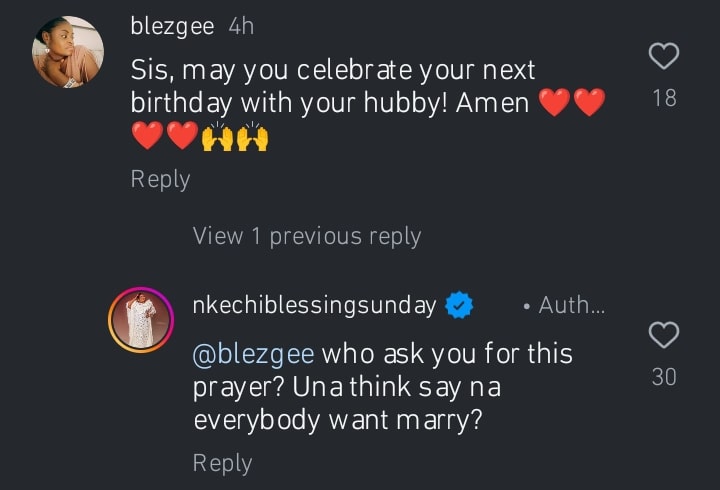 While wishing Nkechi Blessing a happy birthday, the fan added a prayer for her to be married by her next birthday.