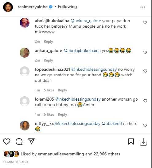 Taking to the comment section, the mother of one wrote, “Yassss!!!! My own mummy and super daddy,” which trialed reactions from a female follower who promised to snatch her husband, Honourable Opeyemi, and other users who assured Nkechi of karma.