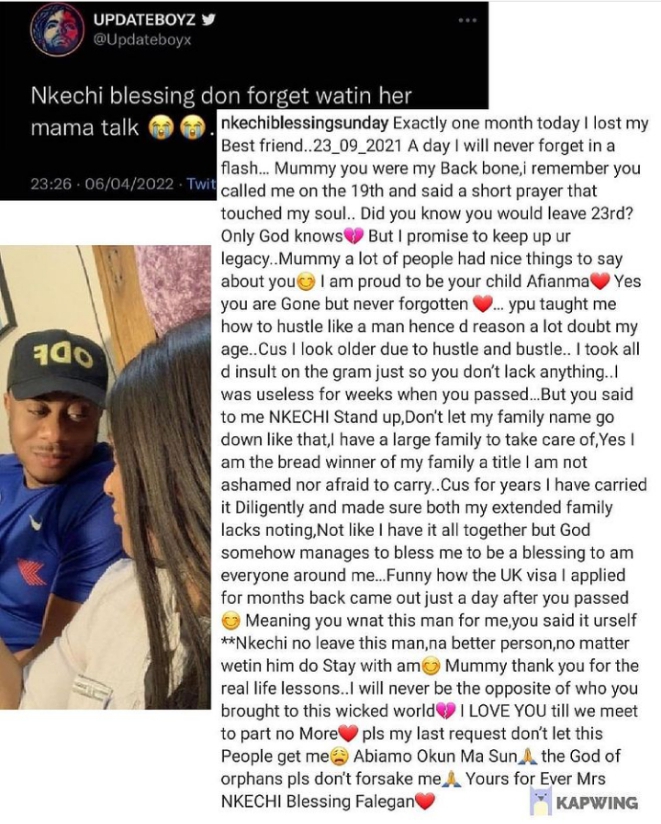 Nollywood actress, Nkechi Blessing Sunday has reacted after Nigerians dug out her old post about her late mother.