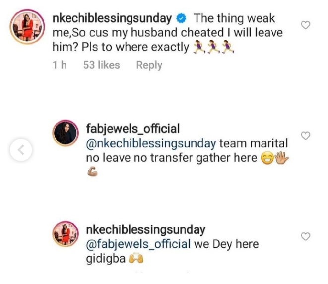 Another post which resurfaced showed Nkechi reiterating that she would never leave her husband even if he cheats on her.