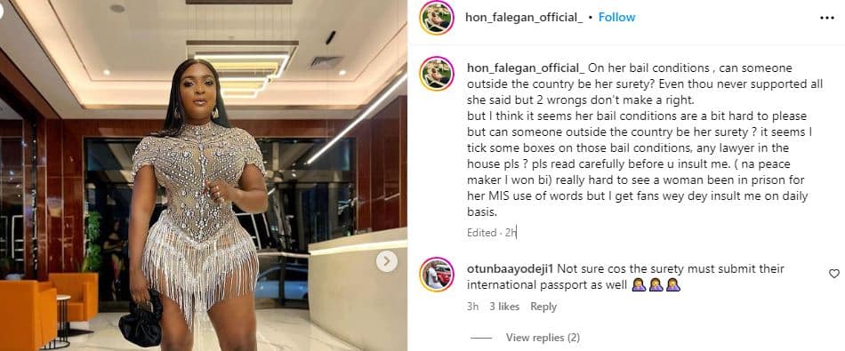but I think it seems her bail conditions are a bit hard to please but can someone outside the country be her surety ? it seems I tick some boxes on those bail conditions, any lawyer in the house pls ? pls read carefully before u insult me. ( na peace maker I won bi) really hard to see a woman been in prison for her MIS use of words but I get fans wey dey insult me on daily basis.”