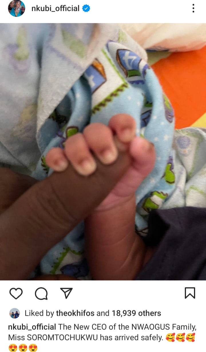 He shared a photo of their baby’s fingers and revealed that they had named her Somtochukwu.