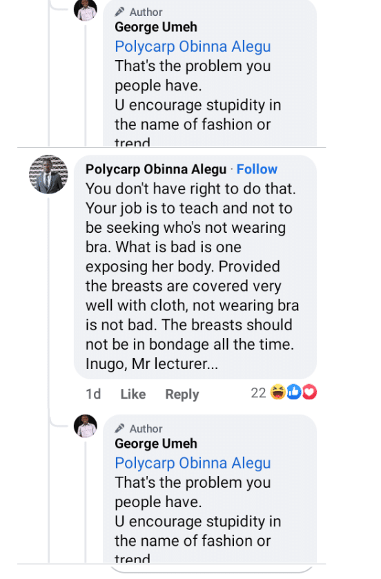 George Umeh, a lecturer at Alex Ekwueme University, Ndufu-Alike, Ikwo (AE-FUNAI), Ebonyi State, expressed his intention to expel any female student attending his class without wearing a bra.