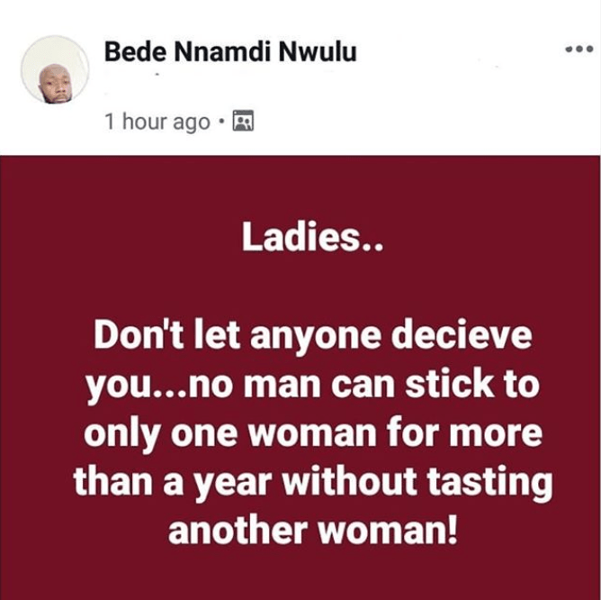 A Nigerian man, Bede Nnamdi Nwulu, on Facebook, has dropped his two cents about men.