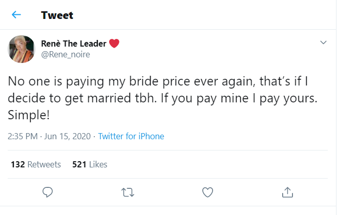 “No one is paying my bride price ever again, that’s if I decide to get married tbh. If you pay mine I pay yours. Simple!” she tweeted.