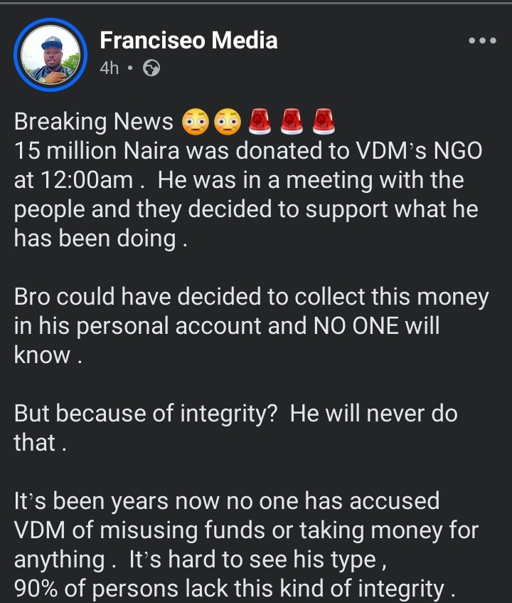 The man identified with the Facebook handle, Franciseo Media disclosed that 15 million naira was donated to VeryDarkMan’s NGO account in the early hours of April 3, 2026.