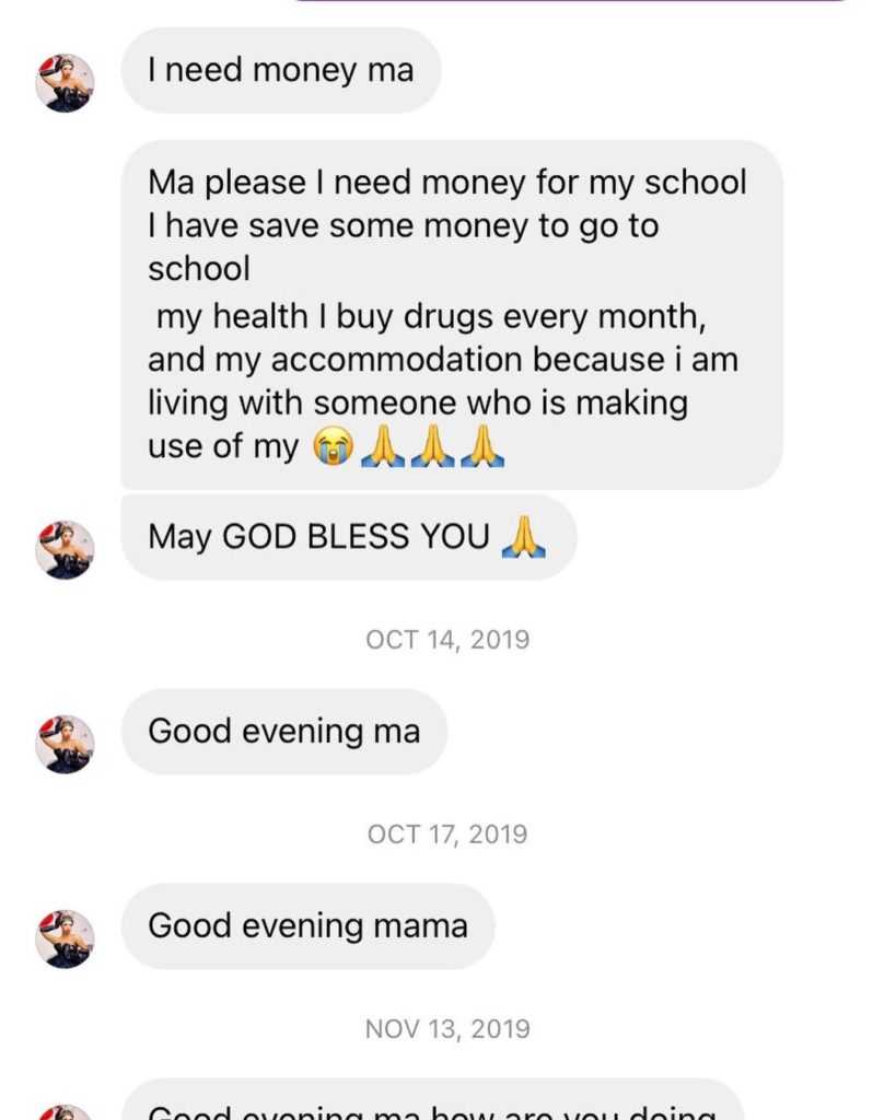 “Good evening ma. am a fan. I love your work. Pls I need your help. I will have love to talk to you on the phone. If you don’t mind.