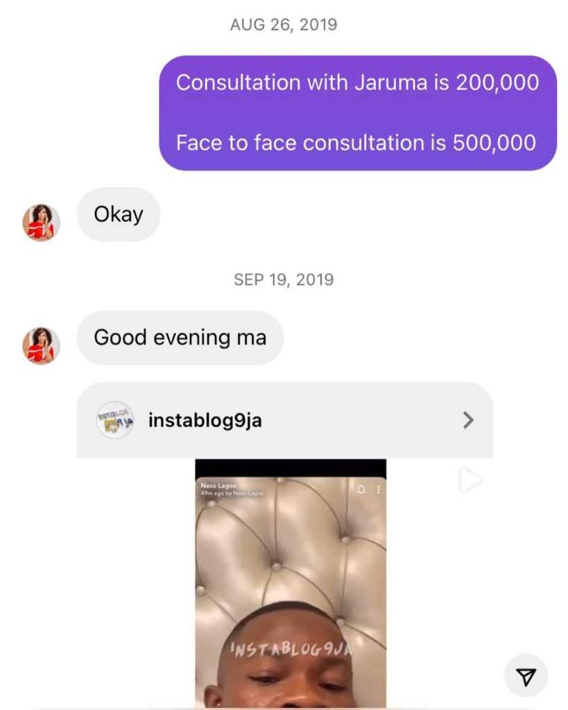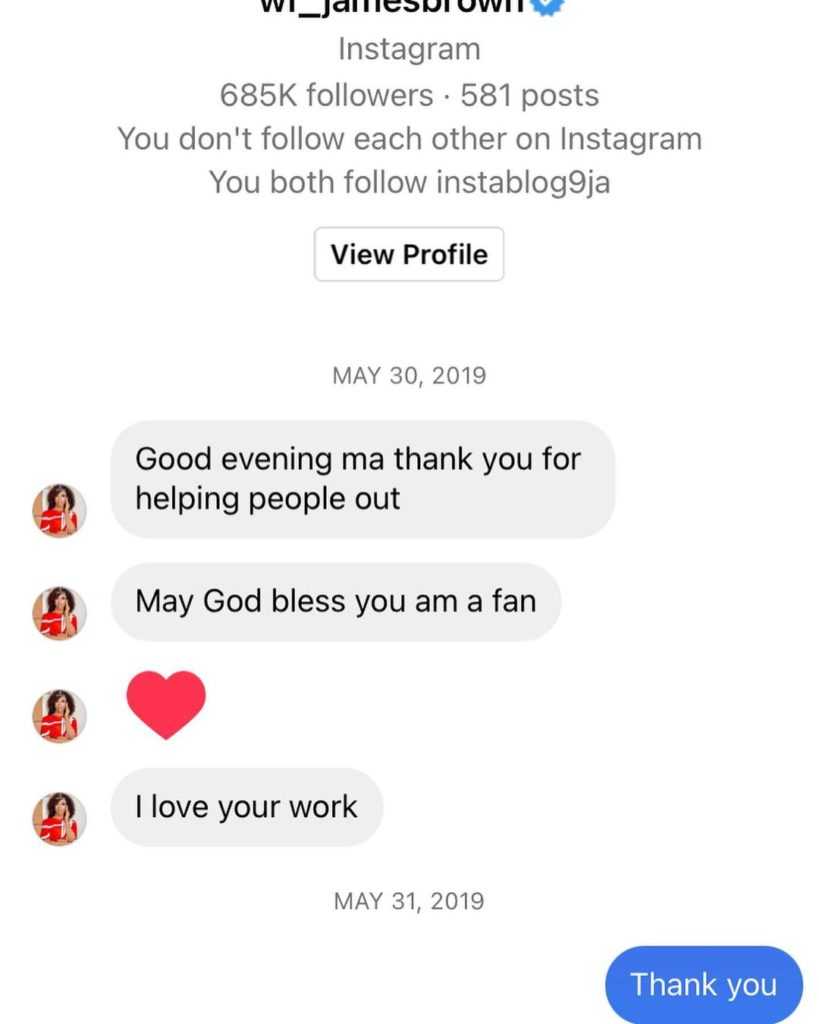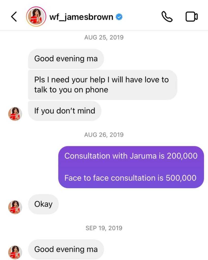 In the screenshots which she shared online, James Brown showered praises on Jaruma over the efficacy of her products.