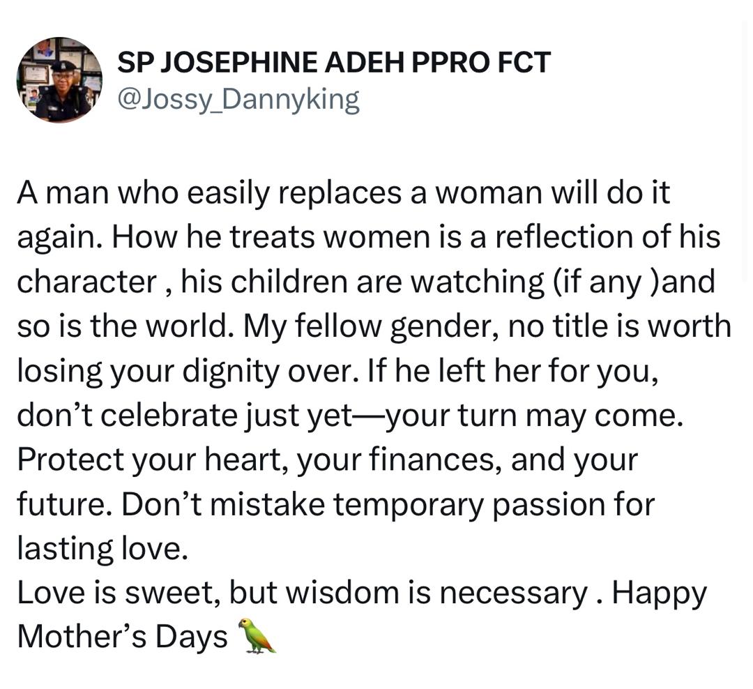 “A man who easily replaces a woman will do it again. How he treats women is a reflection of his character, his children are watching (if any )and so is the world. My fellow gender, no title is worth losing your dignity over. If he left her for you, don’t celebrate just yet—your turn may come. Protect your heart, your finances, and your future. Don’t mistake temporary passion for lasting love. Love is sweet, but wisdom is necessary. Happy Mother’s Day”.