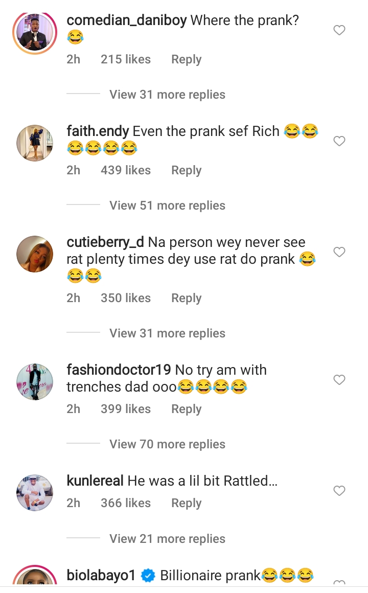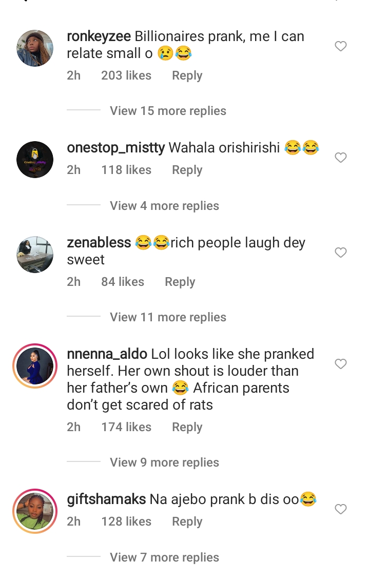 Netizens have reacted to a video of popular Disc Jockey, Florence ifeoluwa Otedola, better known as DJ Cuppy, pranking her father, Femi Otedola with a toy rat.
