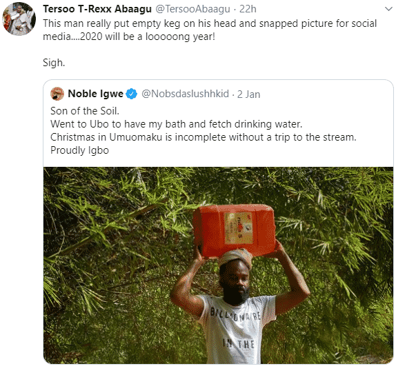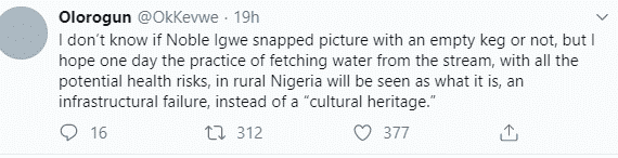 One Twitter user wrote: “I don’t know if Noble Igwe snapped picture with an empty keg or not, but I hope one day the practice of fetching water from the stream, with all the potential health risks, in rural Nigeria will be seen as what it is, an infrastructural failure, instead of a ‘cultural heritage’. “
