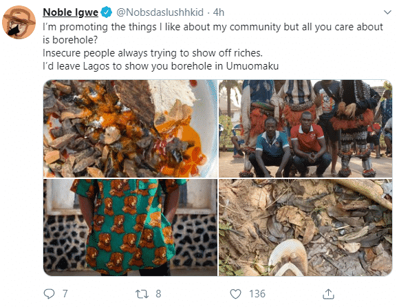 Responding to his critics, Noble Igwe wrote: “I’m promoting the things I like about my community but all you care about is borehole? Insecure people always trying to show off riches. I’d leave Lagos to show you borehole in Umuomaku.”