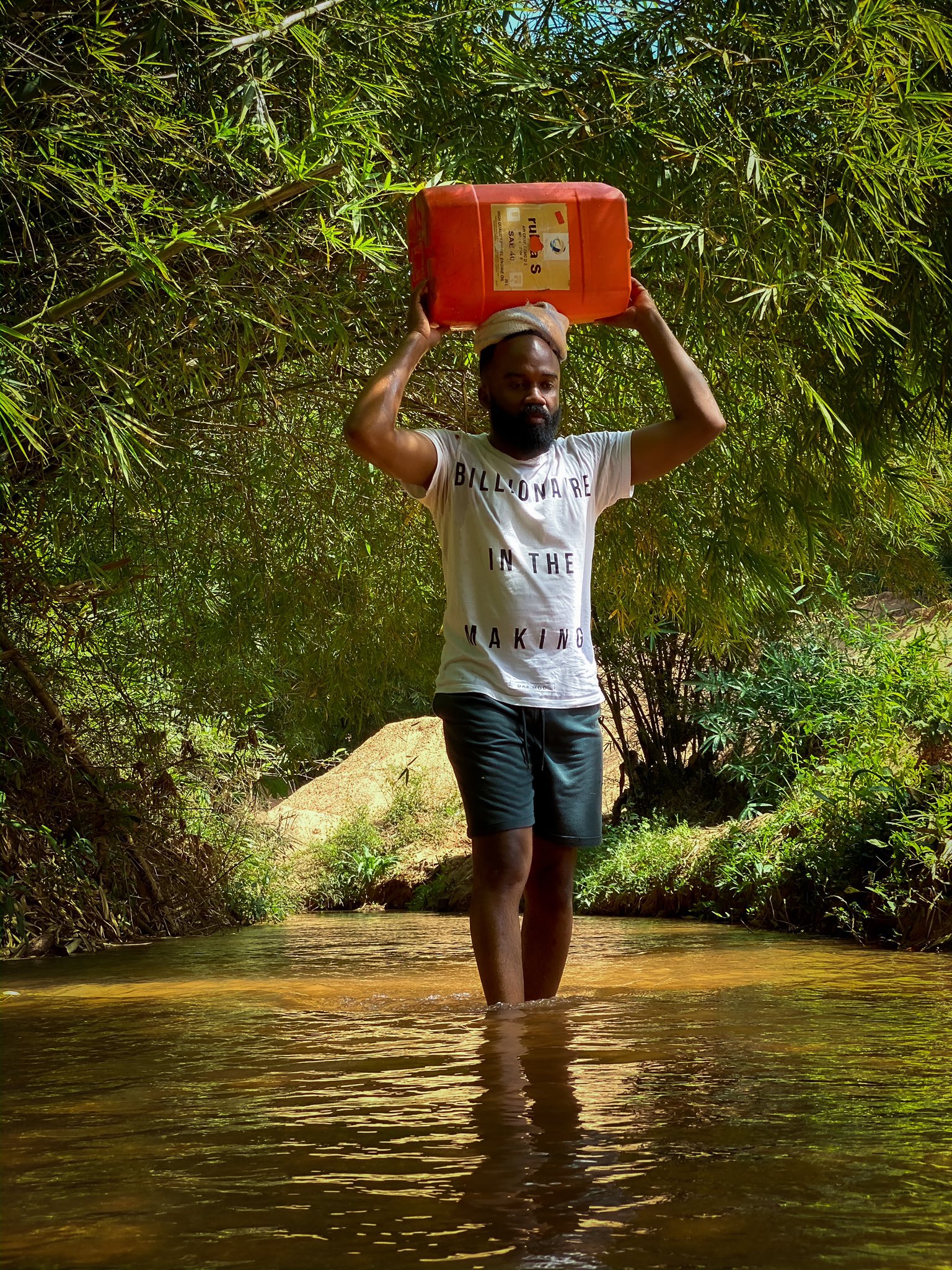 Days ago, the 360nobs founder shared a photo of himself trudging through a shallow stream with a keg of water on his head in his hometown, Umuomaku, Anambra state.