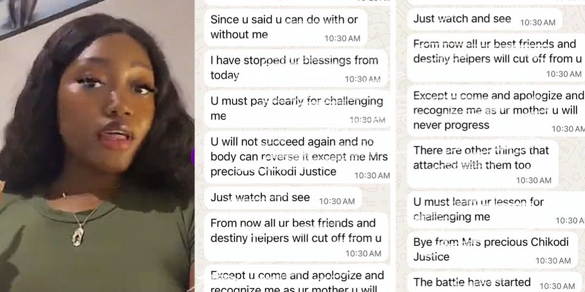 The lady, identified on social media as @atouchofcee, revealed that her mother, Precious Chikodi Justice, sent her messages filled with anger and threats.