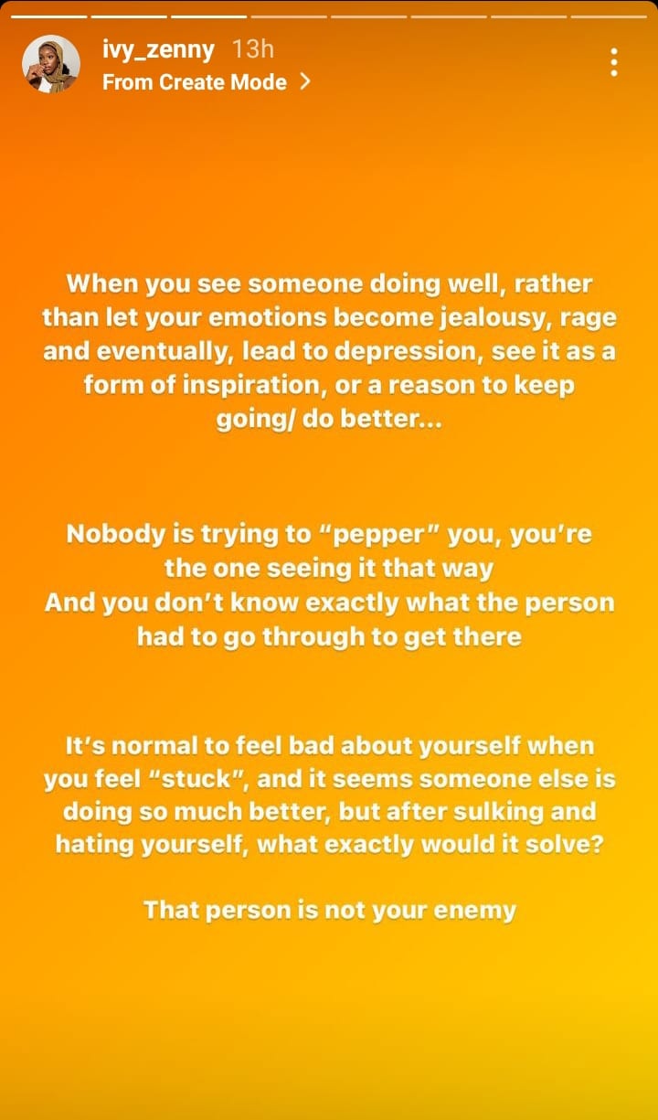 According to her, nobody’s trying to ‘pepper’ anyone and most people may not realize the hard work that preceded what they envy about a person.