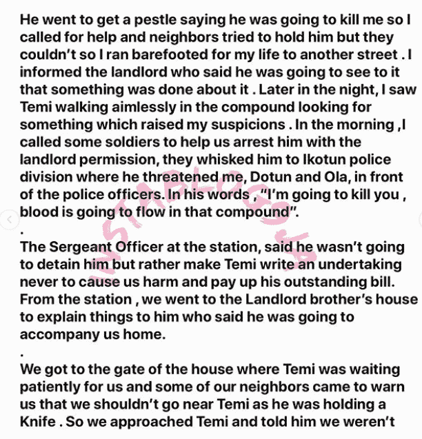 I went to his apartment with another tenant, Ola, and knocked twice on his door. Temi came out in anger and bashed us for knocking on his door. He said, ‘Are you mad ? Are you crazy ? Are you a police officer ?.’