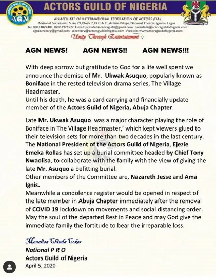 “Until his death, he was a card carrying and financially update member of the Actors Guild of Nigeria, Abuja Chapter.