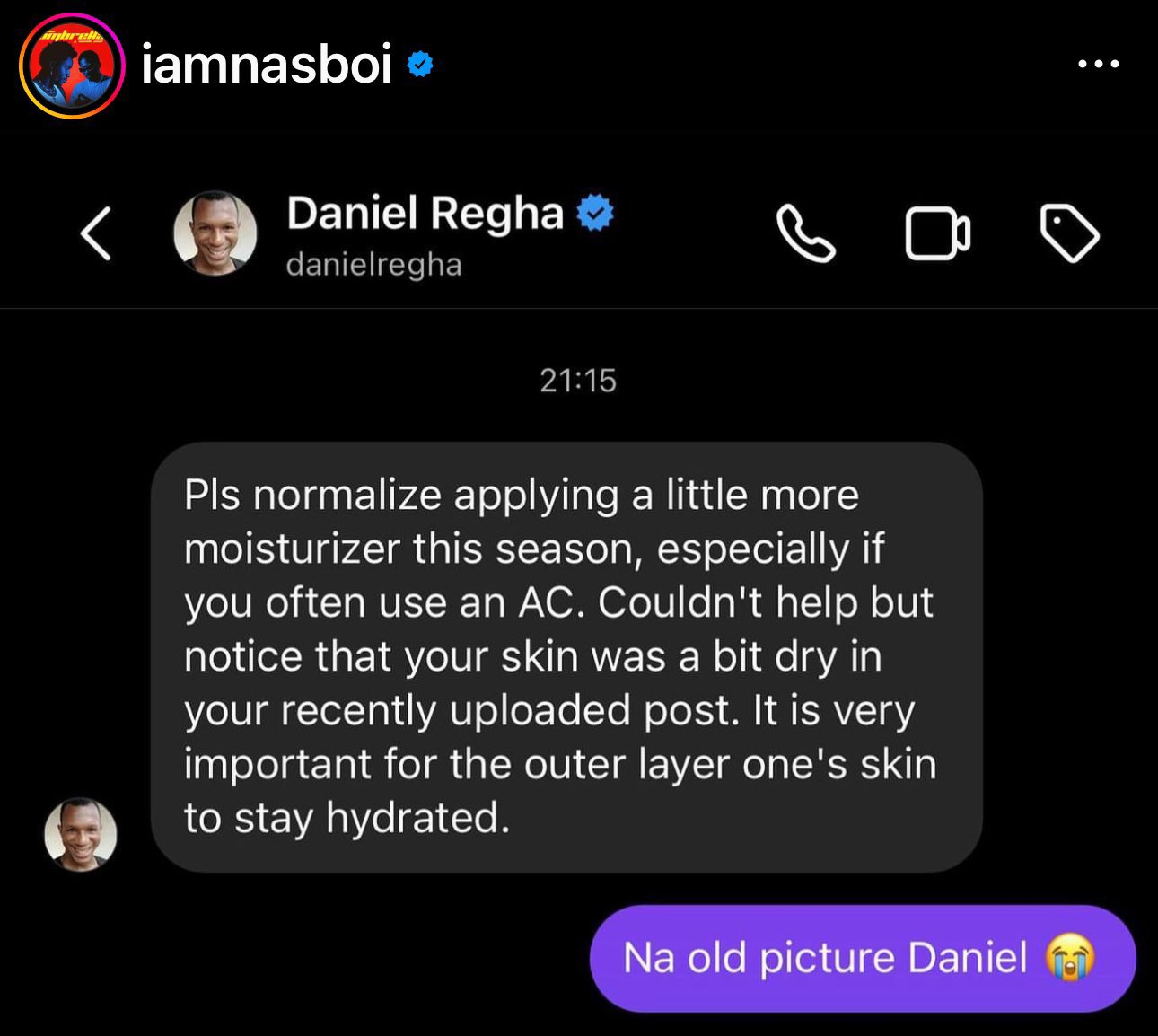 Daniel sent a direct message to Nasboi, advising him to use moisturizer as his skin was a bit dry.