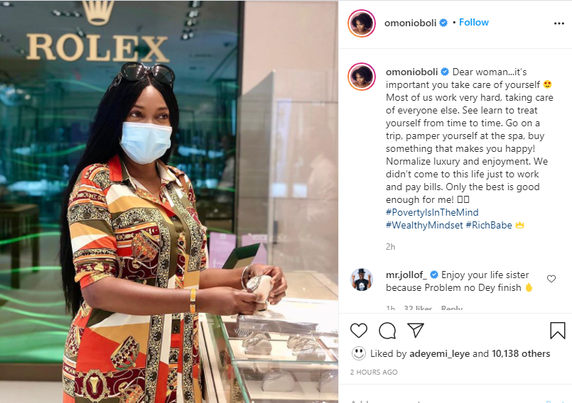 Nollywood actress Omoni Oboli took to her Instagram page to advise women to take care of themselves and also normalize luxury.