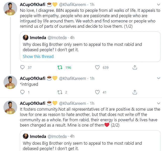 Khafi replied the tweet, saying she disagrees that BBNaija appeals to rabid and debased people.