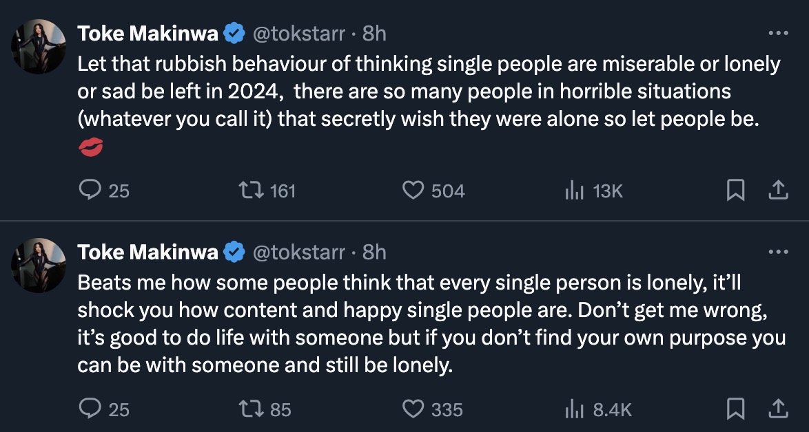 Taken to the social media platform, X, Toke Makinwa argued that there is life outside a relationship and the speculation that being single equates to loneliness is blatantly misleading.