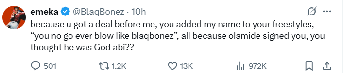 Taking to Twitter to reflect on the situation, Blaqbonez wrote, “Because u got a deal before me, you added my name to your freestyles, ‘you no go ever blow like Blaqbonez’, all because Olamide signed you, you thought he was God abi??”