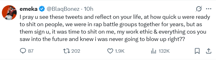 “I pray u see these tweets and reflect on your life, at how quick u were ready to sh*t on people, we were in rap battle groups together for years, but as them sign u, it was time to shit on me, my work ethic & everything cos you saw into the future and knew I was never going to blow up right??”