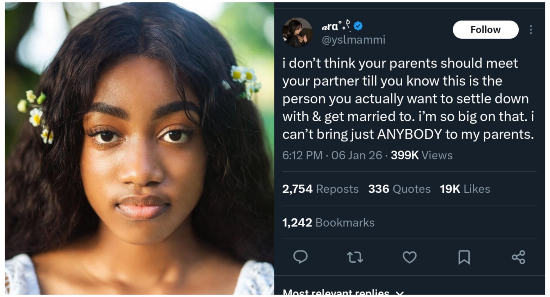 Blaq supported the original post, citing cultural pressure around marriage in Nigeria.HThe e wrote: “100% agree! In Naija, once parents meet your partner, na automatic ‘when is the wedding?’ mode activated 😂. Better to wait till you’re sure about marriage to avoid unnecessary pressure and heartbreak for everyone involved. Wisdom!”