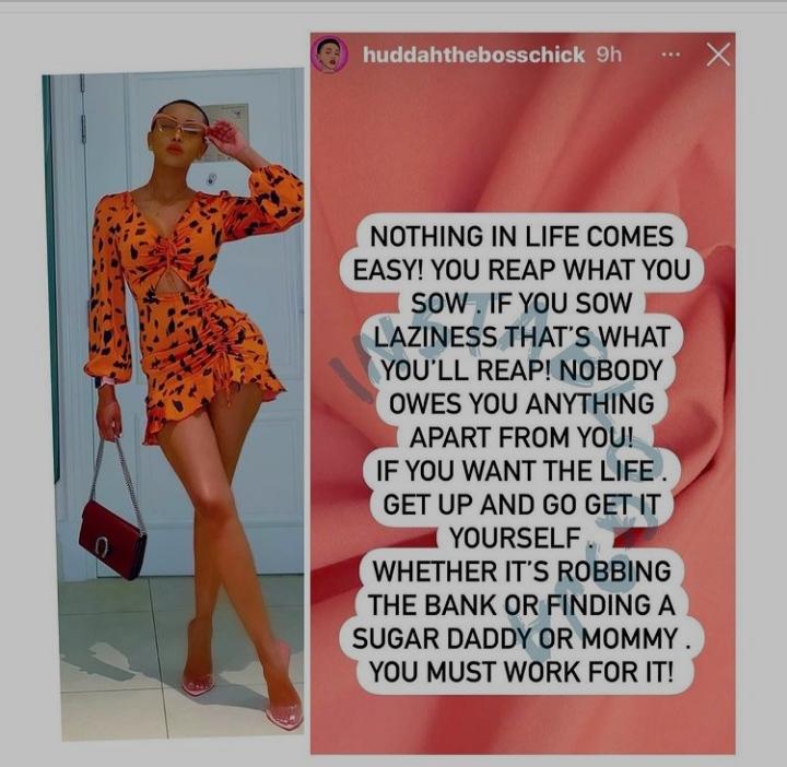 Huddah Monroe, in a post via her Instagram stories, spoke about the importance of hard work; she, however, stressed that nothing in life comes easy even when looking for a sugar mummy or sugar daddy.