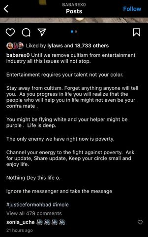 “Until we remove cultism from entertainement industry all this issues will not stop. Entertainment requires your talent not your colour. Stay away from cultism. Forget anything anyone will tell you. As you progress in life you will realize that the people who will help you in life might not even be your confra mate .