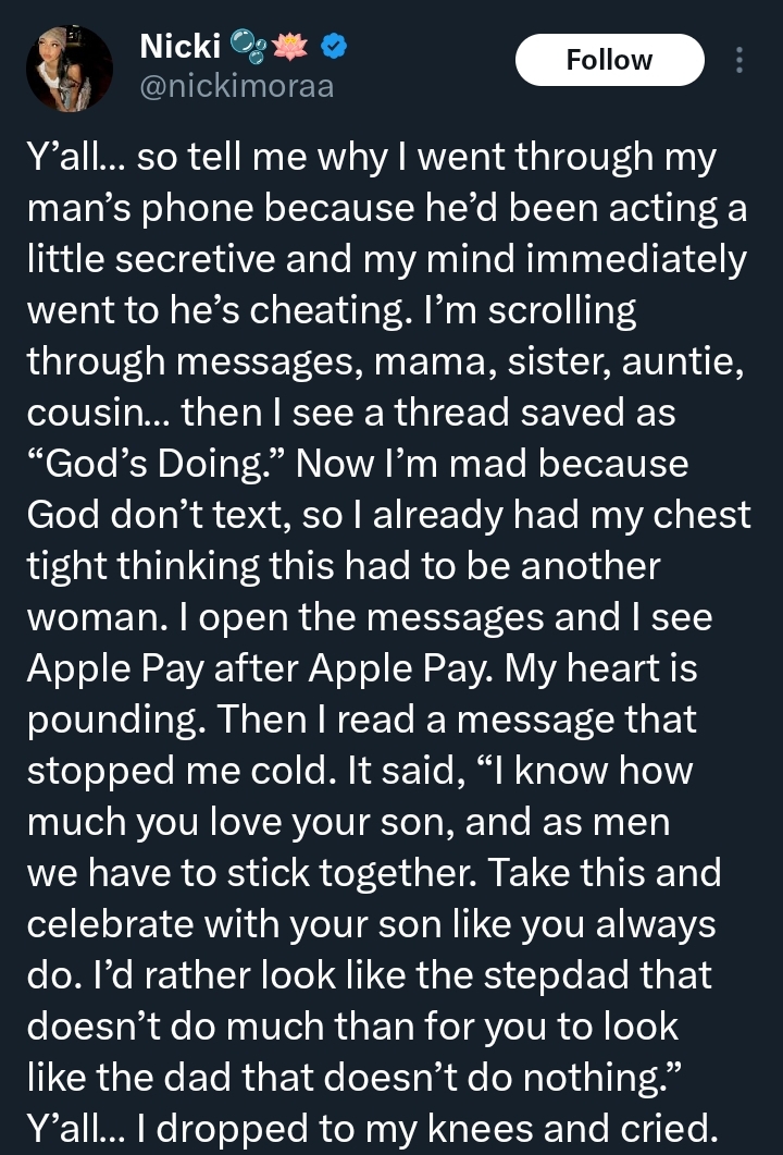 A heartfelt post shared on X (formerly Twitter) has touched many hearts online, after a woman revealed an unexpected act of kindness she discovered on her partner’s phone.
