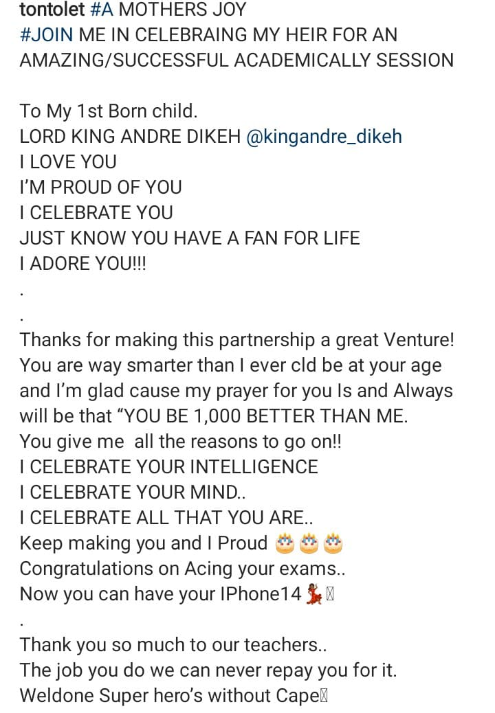 Veteran actress turned politician, Tonto Dikeh intends to reward her son with an iPhone 14 after he passed his school exams with flying colors.
