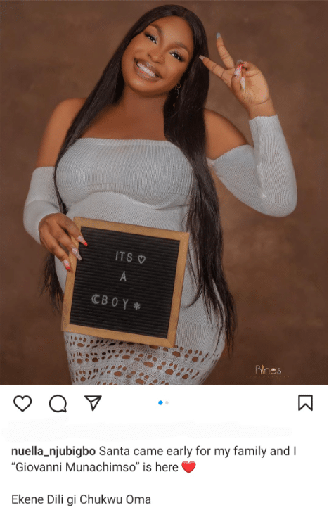 Popular Nollywood actress Nuella Njubigbo took to Instagram to joyously announce the arrival of her baby boy, whom she named Giovanni Munachimso.