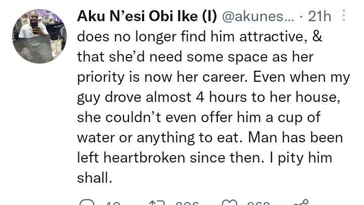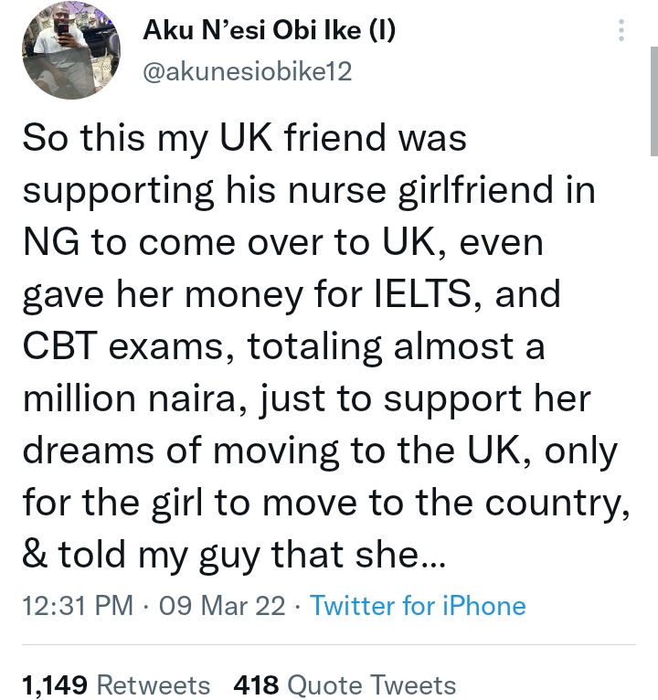 “So this my UK friend was supporting his nurse girlfriend in NG to come over to UK, even gave her money for IELTS, and CBT exams, totaling almost a million naira, just to support her dreams of moving to the UK, only for the girl to move to the country, & told my guy that she no longer find him attractive, & that she’d need some space as her priority is now her career. Even when my guy drove almost 4 hours to her house, she couldn’t even offer him a cup of water or anything to eat. Man has been left heartbroken since then. I pity him shall.”